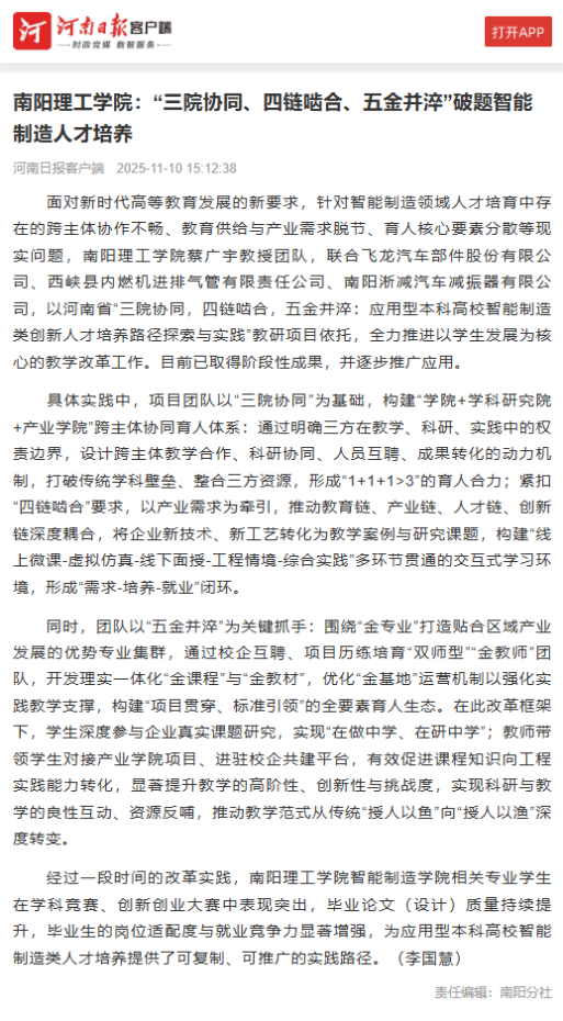 tyc7111cc太阳成集团:“三院协同、四链啮合、五金并淬”破题智能制造人才培养