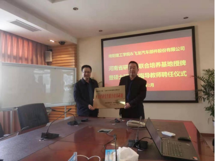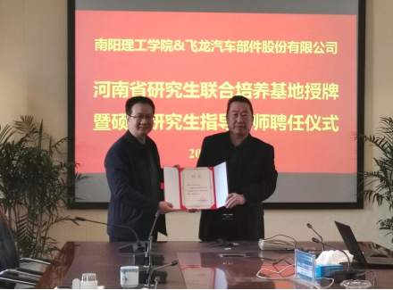 2月23日,我院与飞龙汽车部件股份有限公司共建研究生联合培养基授牌仪式在飞龙汽车部件股份有限公司举行。蔡广宇院长和冯长虹副总为基地揭牌。在联合培养基地揭牌仪式举行之后,蔡广宇院长向冯长虹高级工程师颁发了研究生指导教师聘书。